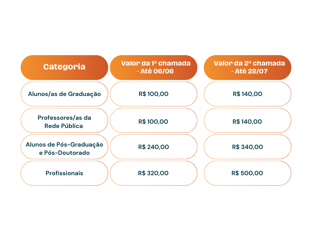 As inscrições deverão ser efetuadas por meio do preenchimento do formulário online observando-se os prazos estabelecidos para cada modalidade de inscrição, e mediante o pagamento das respectivas taxas referentes a cada uma das formas de participação no evento. A inscrição somente estará efetivada após o pagamento da taxa referente à categoria escolhida.
